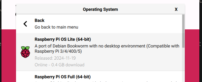 I picked the OS lite version, which is basically just a CLI. I flashed a 4Gb microSD card with the image using the Pi Imager.